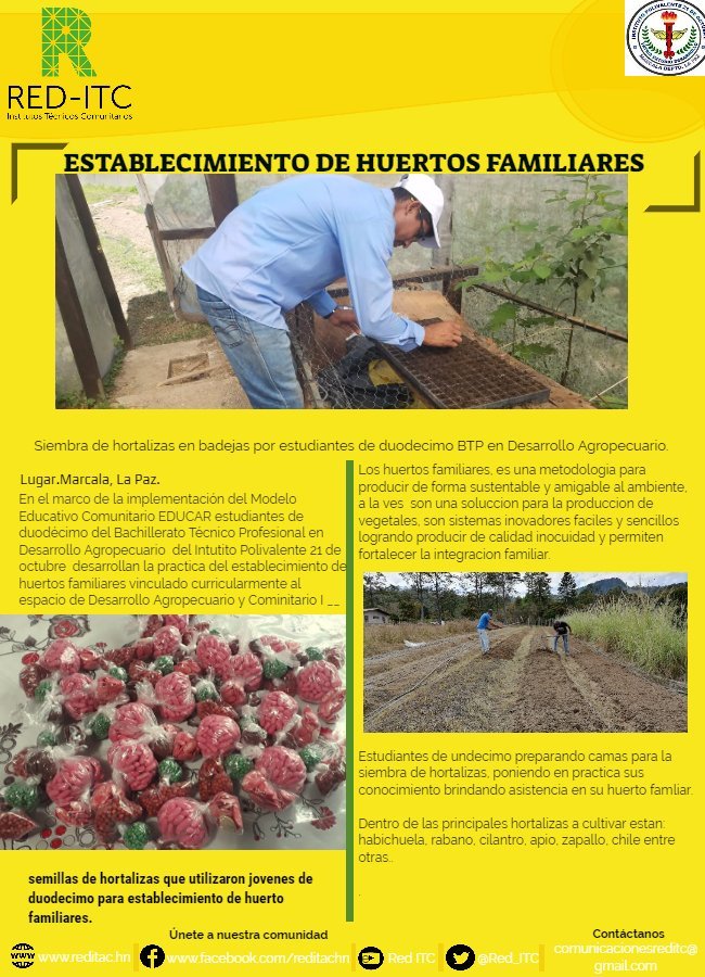 Mediante la ejecución del Modelo Educativo Comunitario EDUCAR que implementa la RED I.T.C. En la aldea El Coyolar Guarita Lempira; los estudiantes de duodécimo de la carrera de BTP en Desarrollo Agropecuario del IGTC David Hércules Navarro, desarrollan la actividad de Acompañamiento a Conglomerado de Miel en el Espacio Curricular de Extensión Comunitaria, convirtiéndose así, […]