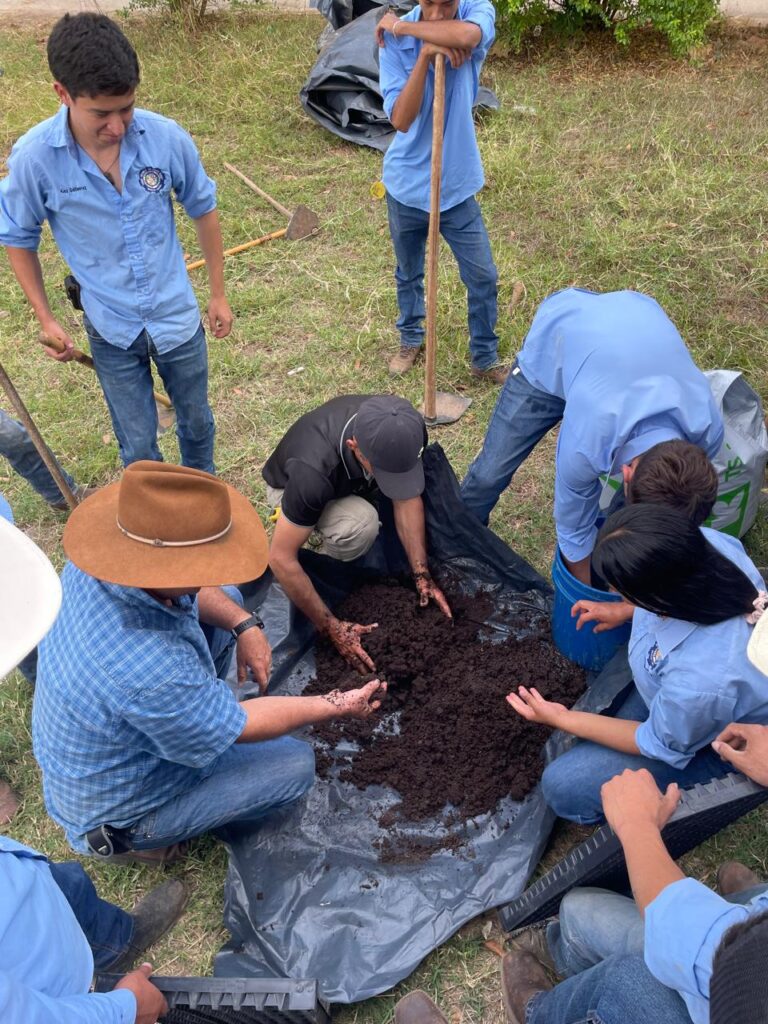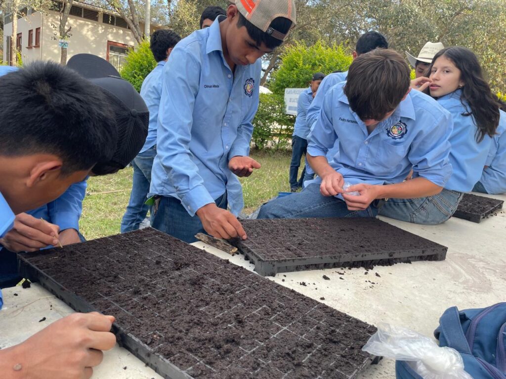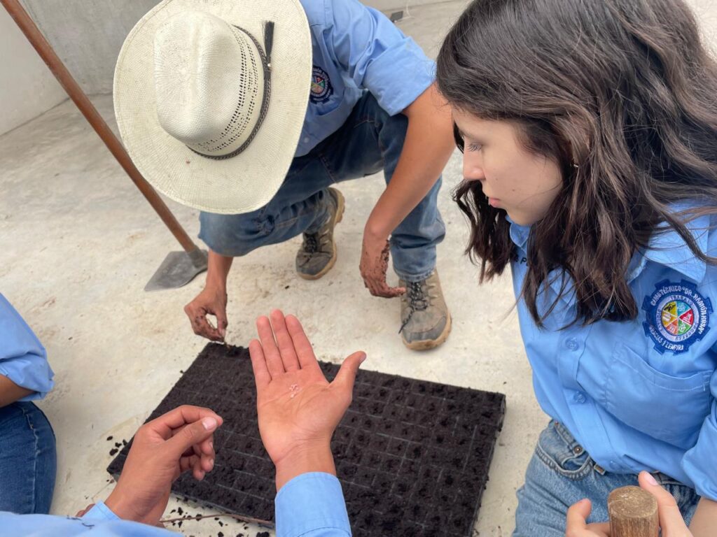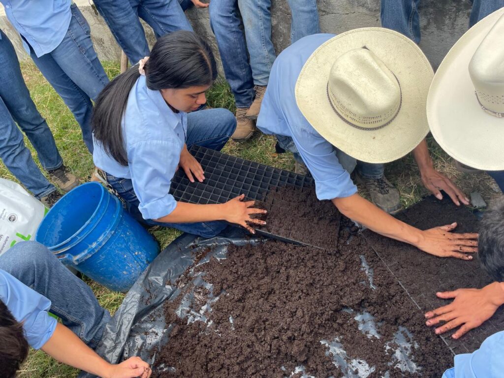 En el marco de la implementacion del Modelo Educativo Comuinitario EDUCAR, los estudiantes del doceavo grado del BTP IDAF en le espacio curricular de Agricultura Sostenible preparan sustrato y establecen semilleros de lechuga, tomate y chile en bandejas con el apoyo del Ing. Donaldo Argueta de la FAO. Mediante esta tècnica se obtienen plàntulas sanas, uniformes y listas para trasplante, y los estudiantes aprenden a: Preparaciòn del sustrato èste debe ser: suelto,bien drenado y rico en materia orgànica. Se debe humedecer ligeramente (no encharcar); llenado de bandejas, se llena cada vicadad sin compactar demasiado, nivelar la superficie; Siembra, de 1-2 semillas por cavidad a una profundidad de 0.5-1 cm y esperar su germinacion para su trasplante. «APRENDER HACIENDO»