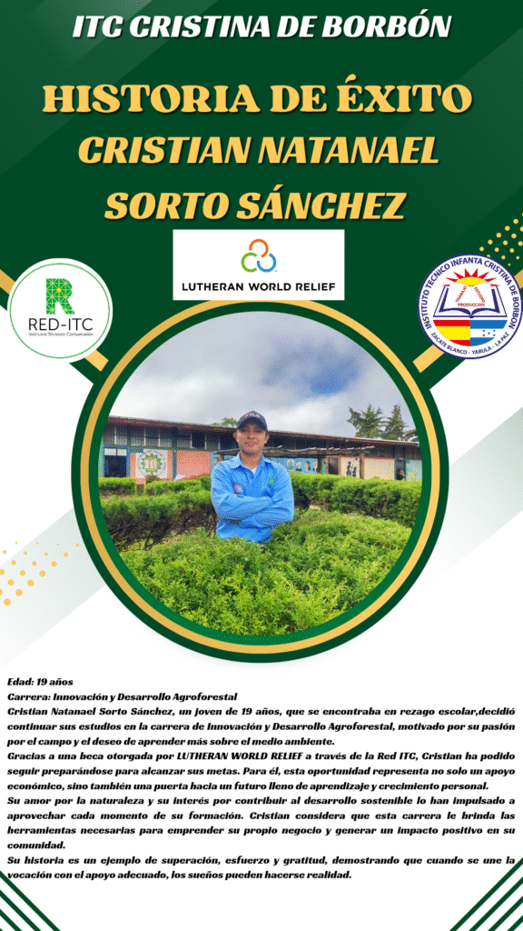 ¡Las segundas oportunidades también florecen cuando hay esfuerzo y determinación! 💪✨ Hoy destacamos la historia de Cristian Natanael Sorto Sánchez, un joven que decidió retomar su camino educativo en el ITC Cristina de Borbón, matriculándose en el Bachillerato Técnico Profesional en Innovación y Desarrollo Agroforestal. Cristian, beneficiario de una beca otorgada por Lutheran gracias a la Red ITC, nos demuestra que nunca es tarde para luchar por nuestros sueños. 🌿 Su amor por el campo, el medio ambiente y su deseo de aprender lo impulsan a seguir formándose para, en un futuro, emprender su propio proyecto agroforestal. 🌾🌳 Desde el ITC Cristina de Borbón celebramos su perseverancia y motivamos a más jóvenes a creer en sí mismos, porque la educación transforma vidas. 📘💚