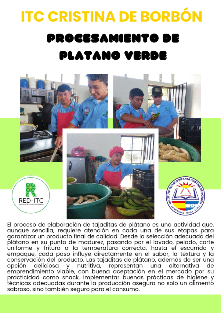 Jóvenes del Duodécimo grado en Innovación y Desarrollo Agroforestal realizaron el procesamiento de plátano verde, durante dicha actividad los estudiantes seleccionaron, pelaron, cortaron, deshidrataron, frieron y empaquetaron el plátano obteniendo ricas y deliciosas tajaditas.